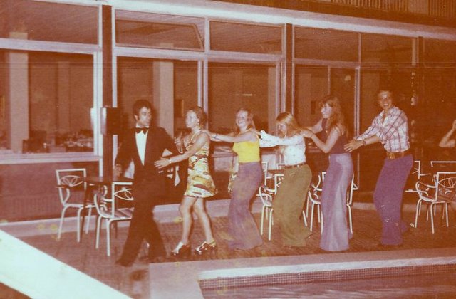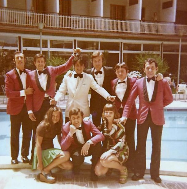 Foto tomada el verano del año 1969 en el Bar del Hotel Flamingo , Yo con camareros del Bar y dos clientes del Hotel