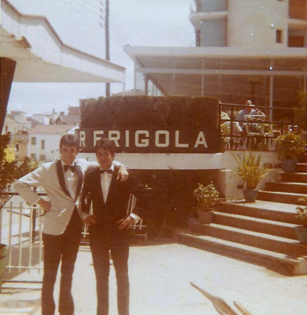 Joaquin Lleonart Maitre hotel en 1969 con Ado un camarero del Bar del Hotel Flamingo , foto tomada en 1969 al fondo esta el Hotel Frigola antiguo dos años antes de ser derribano y edificar lo que hoy en dia es