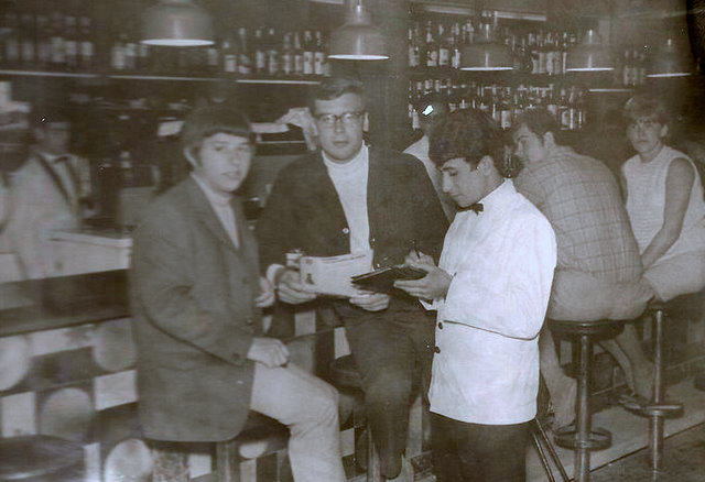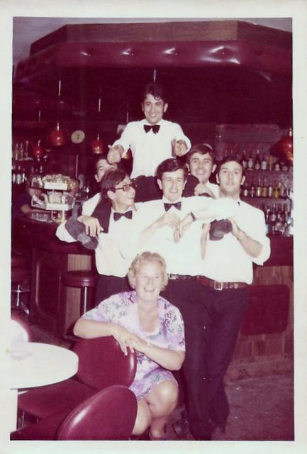 Foto tomada el verano del año 1969 en el Bar del Hotel Flamingo , Yo con camareros del Bar y dos clientes del Hotel